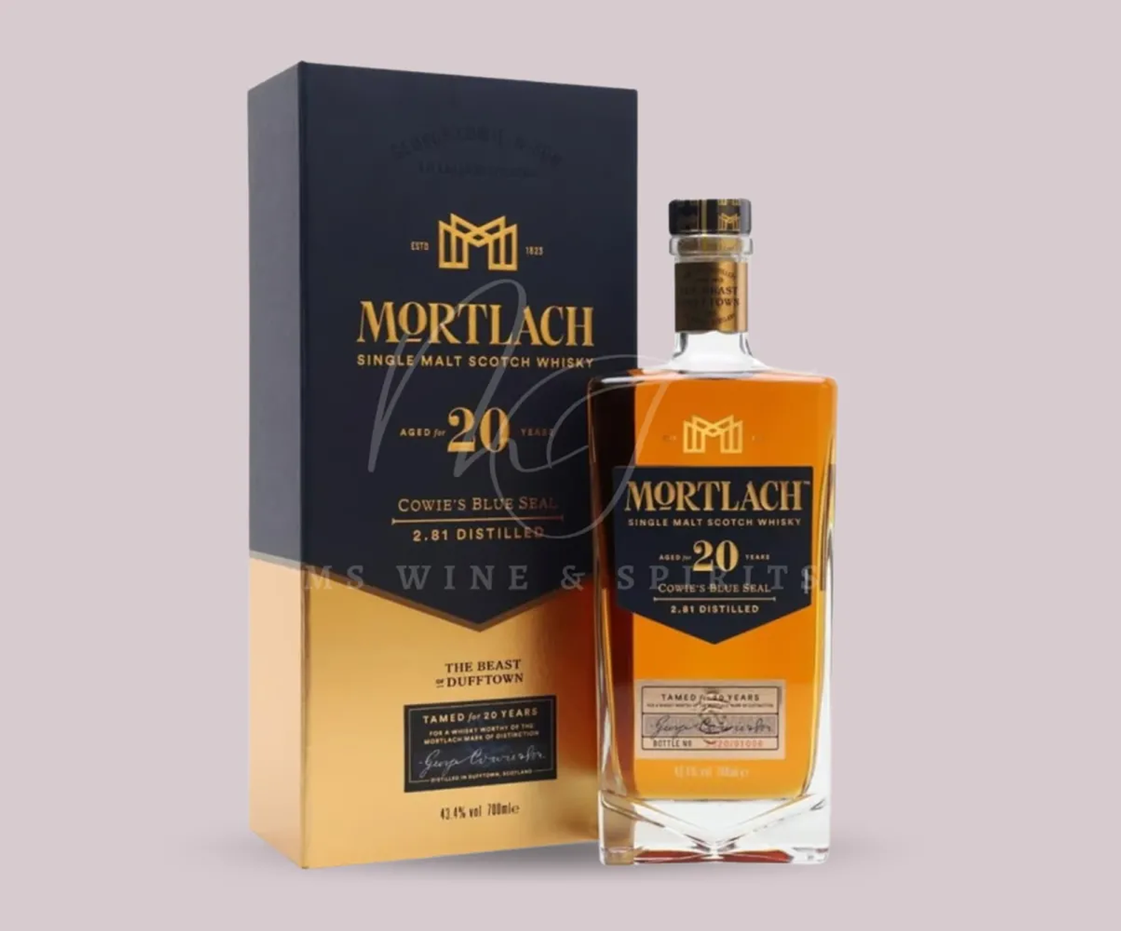 Mortlach 20 Years Old “Cowie’s Blue Seal” is a premium single malt Scotch whisky from Mortlach in Dufftown, Speyside. Matured for 20 years exclusively in sherry-seasoned casks, it showcases Mortlach’s signature richness—meaty, full-bodied, with complex layers born of patient ageing. Bottled at 43.4% ABV, it represents the oldest expression in Mortlach’s core range (as of its release), aimed at connoisseurs who value depth, oak integration, fruit complexity, and mature spice in their dram.